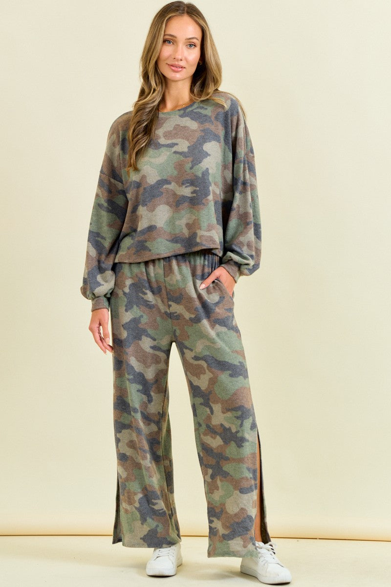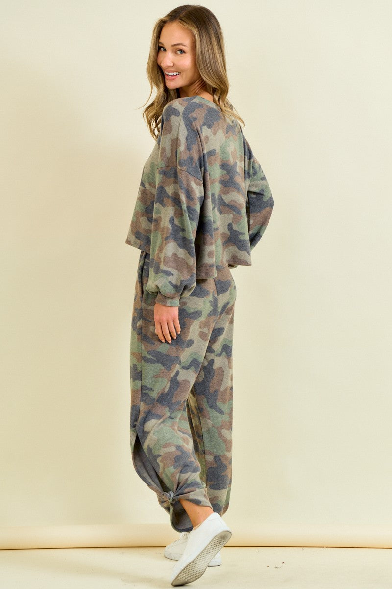 Our Fairfax Army Camo set is made of light weight material. Top features a round neckline and banded cuff. The pants have an elastic waist band, features an open slit at the bottom.