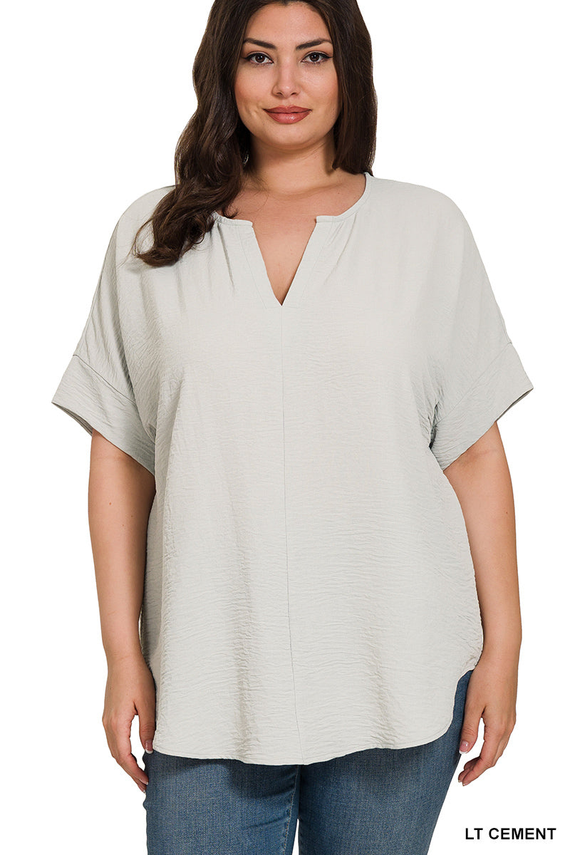 PLUS WOVEN AIRFLOW SPLIT NECK SHORT SLEEVE TOP