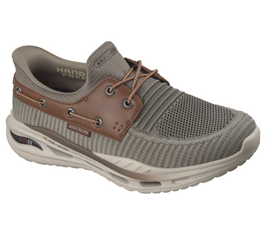 Iconic style meets innovative comfort in Skechers Hands Free Slip-ins® Relaxed Fit®: Arch Fit® Orvan - Shoreman. Designed with our Heel Pillow®, this roomy vegan slip-on features a knit and synthetic overlay upper with no-tie deco laces, a shock-reducing Arch Fit® insole, and our geometric Glide-Step® cushioned midsole.