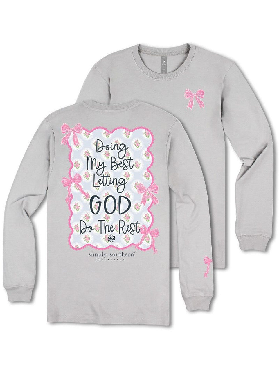 Sport grey long sleeve shirt with the phrase 'Doing my best, Letting God do the rest' adorned with pink bows on a floral background. Simply Southern logo below. Pink bow on left chest and right sleeve. 100% cotton. Unisex youth sizing.