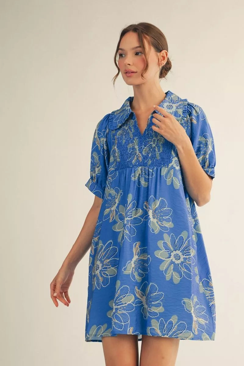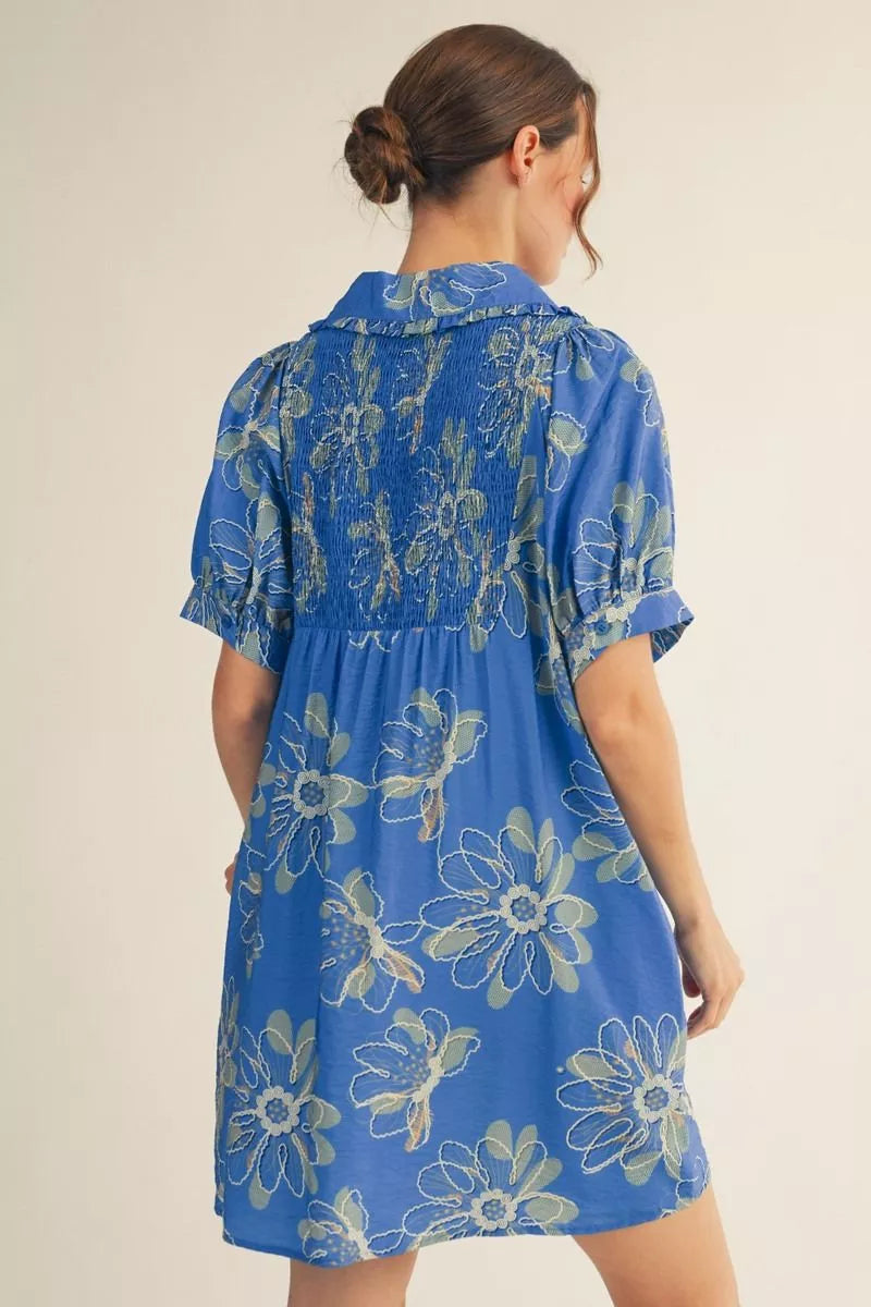 Short sleeves lovely floral dress with side pockets, ruffle detail peter pan neck collar, smocked upper body.- Model is 5'10'' and is wearing a Small.Fabric content: