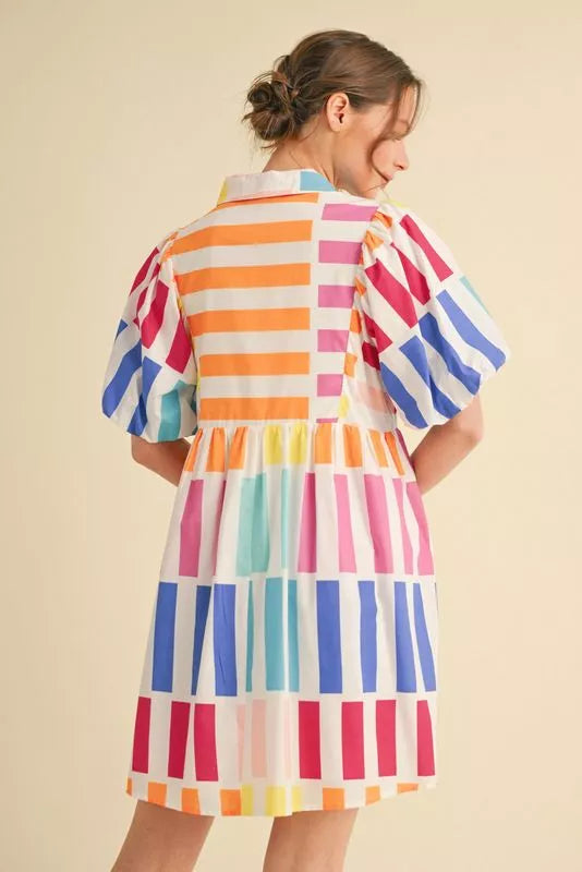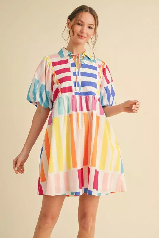A vibrant striped baby doll dress with collared tied neck, side pockets, and short puffed sleeves.- Non-sheer, lightweight.- Model is 5'10'' and is wearing a Small.Fabric content: