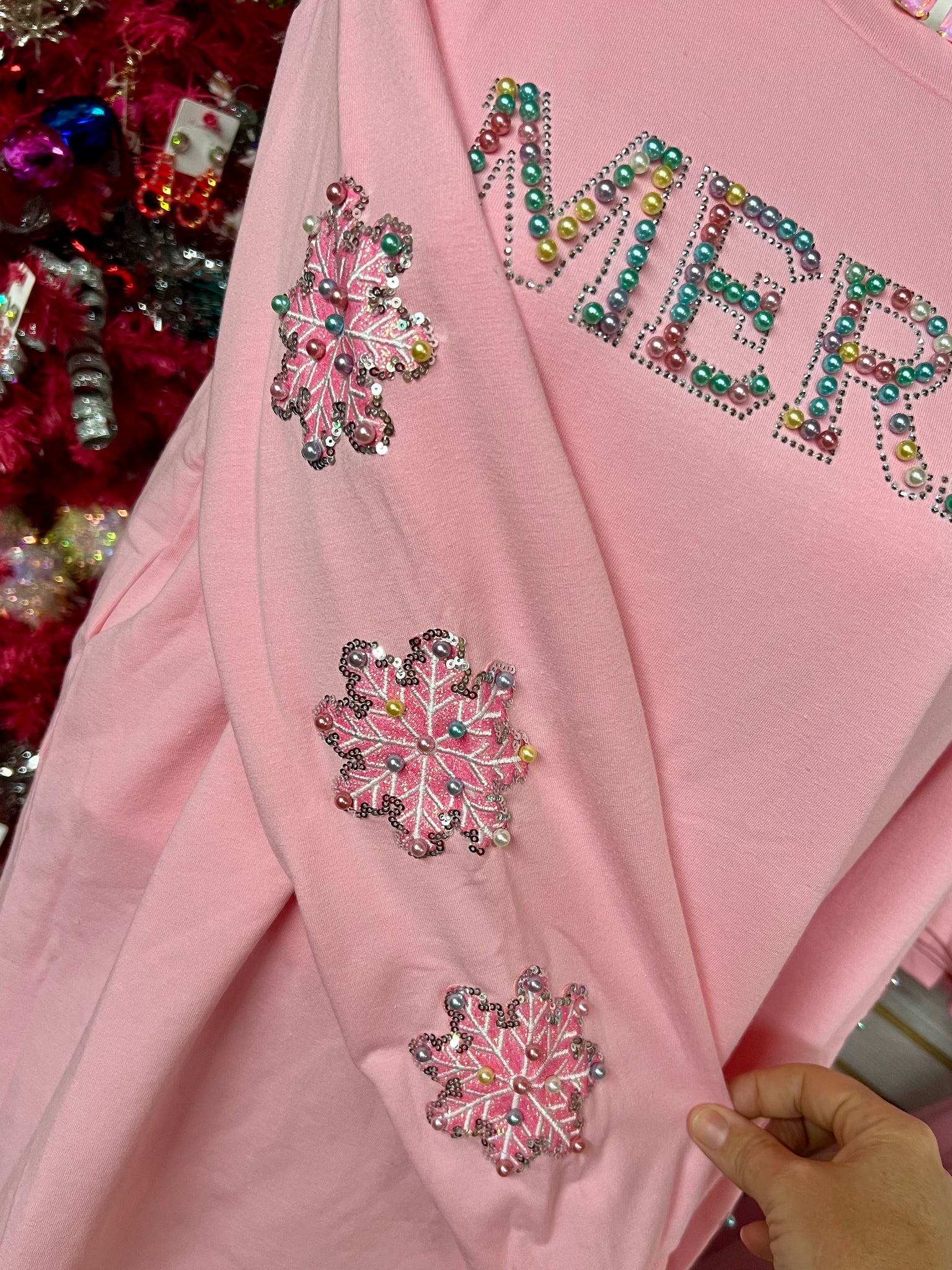 Shine bright this holiday season in the Beaded Merry Long Sleeve Tee from Grace & Emma! This lightweight, pastel pink top features a stunning “MERRY” beaded appliqué across the front and sparkling snowflake appliqués down both sleeves for the perfect touch of festive flair. Soft, stylish, and effortlessly feminine — it’s the ultimate holiday top for parties, photos, or cozy winter days!