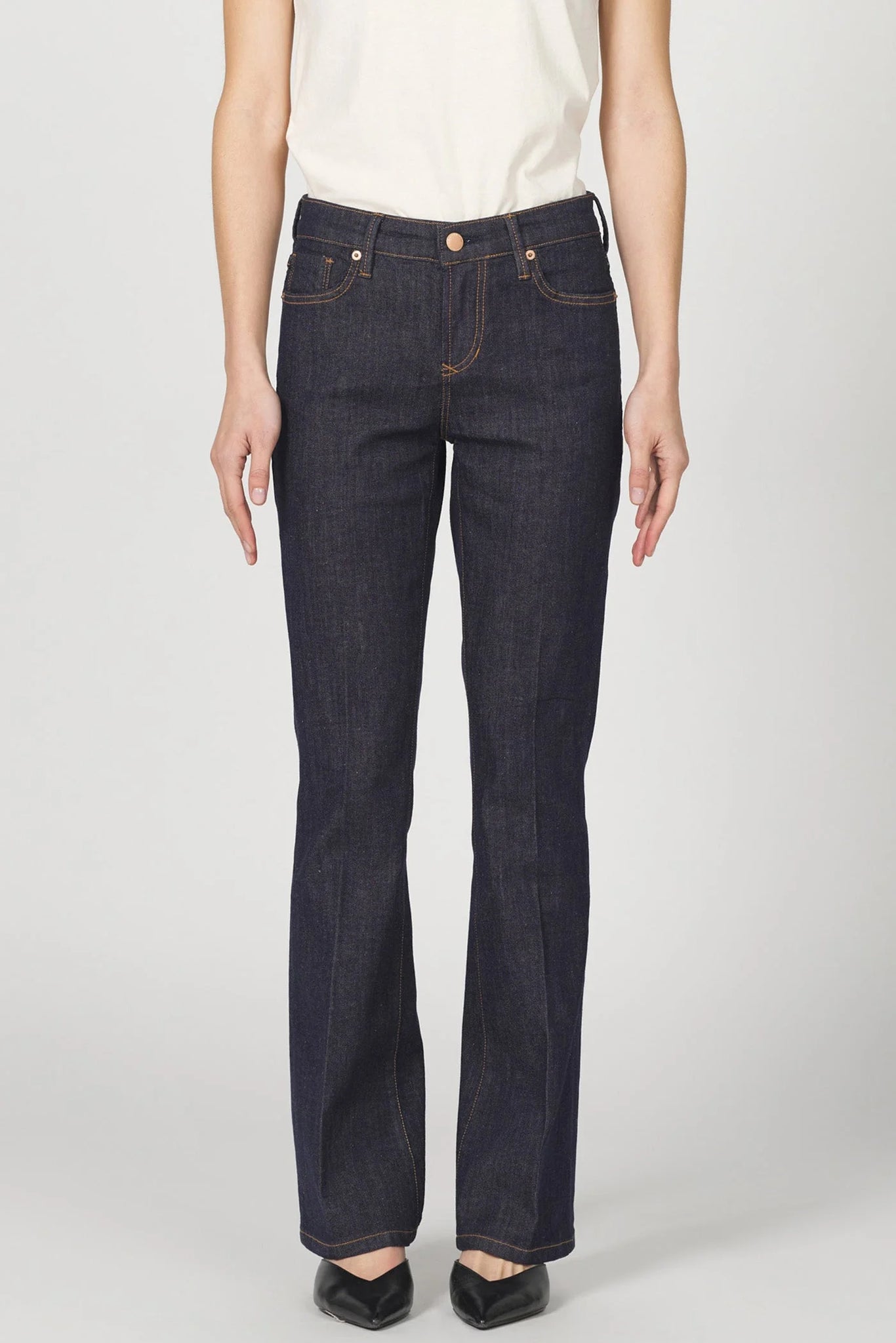 Mid rise dark denim pant featuring a clean hem, perfect for any casual or semi-formal occasion.