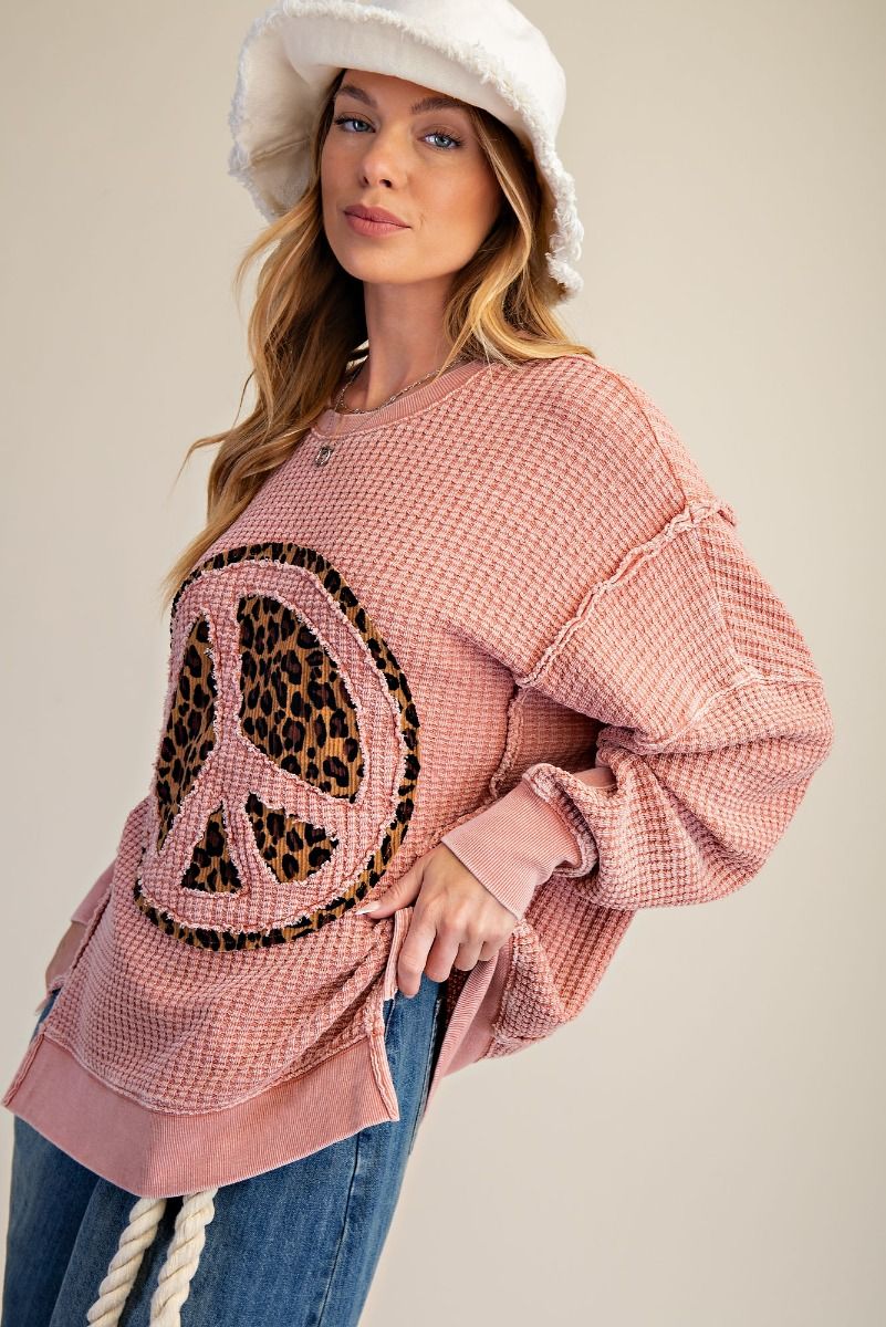 PEACE PATCH WASHED THERMAL PULLOVER-RELAXED, OVERSIZED FIT-MINERAL WASHED-WAFFLE KNIT TEXTURE-CREW NECKLINE-SIDE SLITS-ANIMAL PRINTED PEACE PATCH-DROPPED SHOULDER-1X MEASUREMENTS : LENGTH - 26 5/8" & BUST - 29"