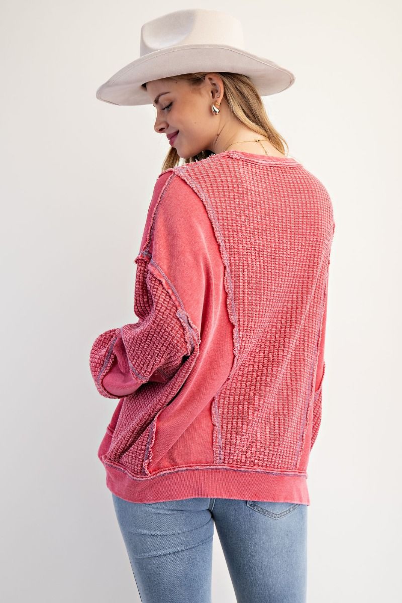 WASHED THERMAL MIX TERRY PULLOVER-MINERAL WASHED-RELAXED-FIT CREWNECK SWEATSHIRT-WAFFLE KNIT TEXTURE-EXPOSED RAW-EDGE SEAMS-DROPPED SHOULDERS-SMALL MEASUREMENTS : LENGTH - 25" & BUST - 28.5"