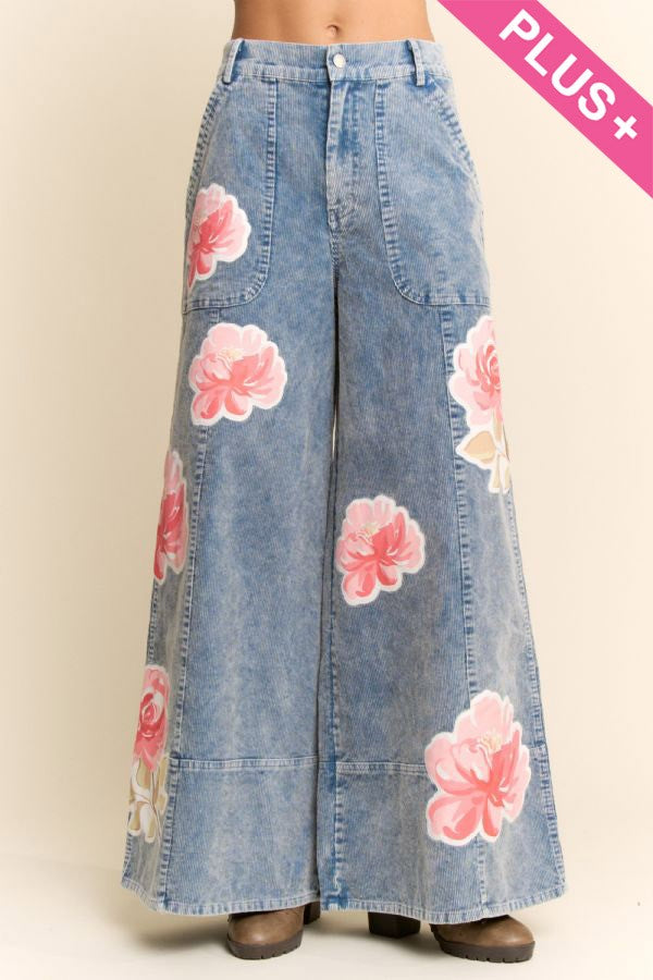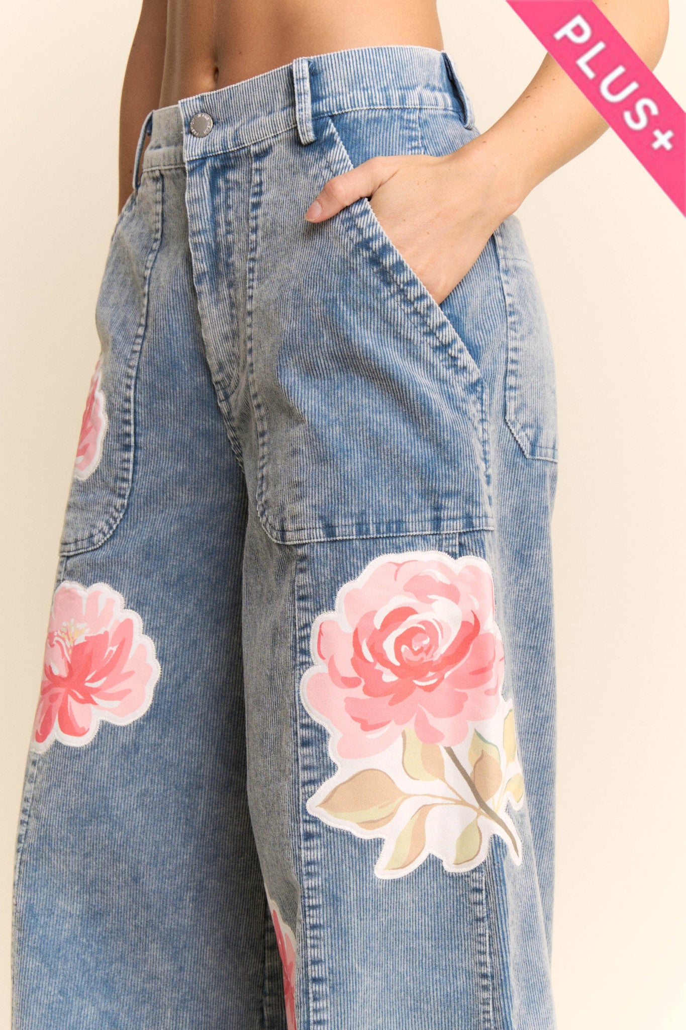 PLUS WASHED CORDUROY PRINTED VINTAGE FLOWER PATCHES WIDE OPENING PANTS
